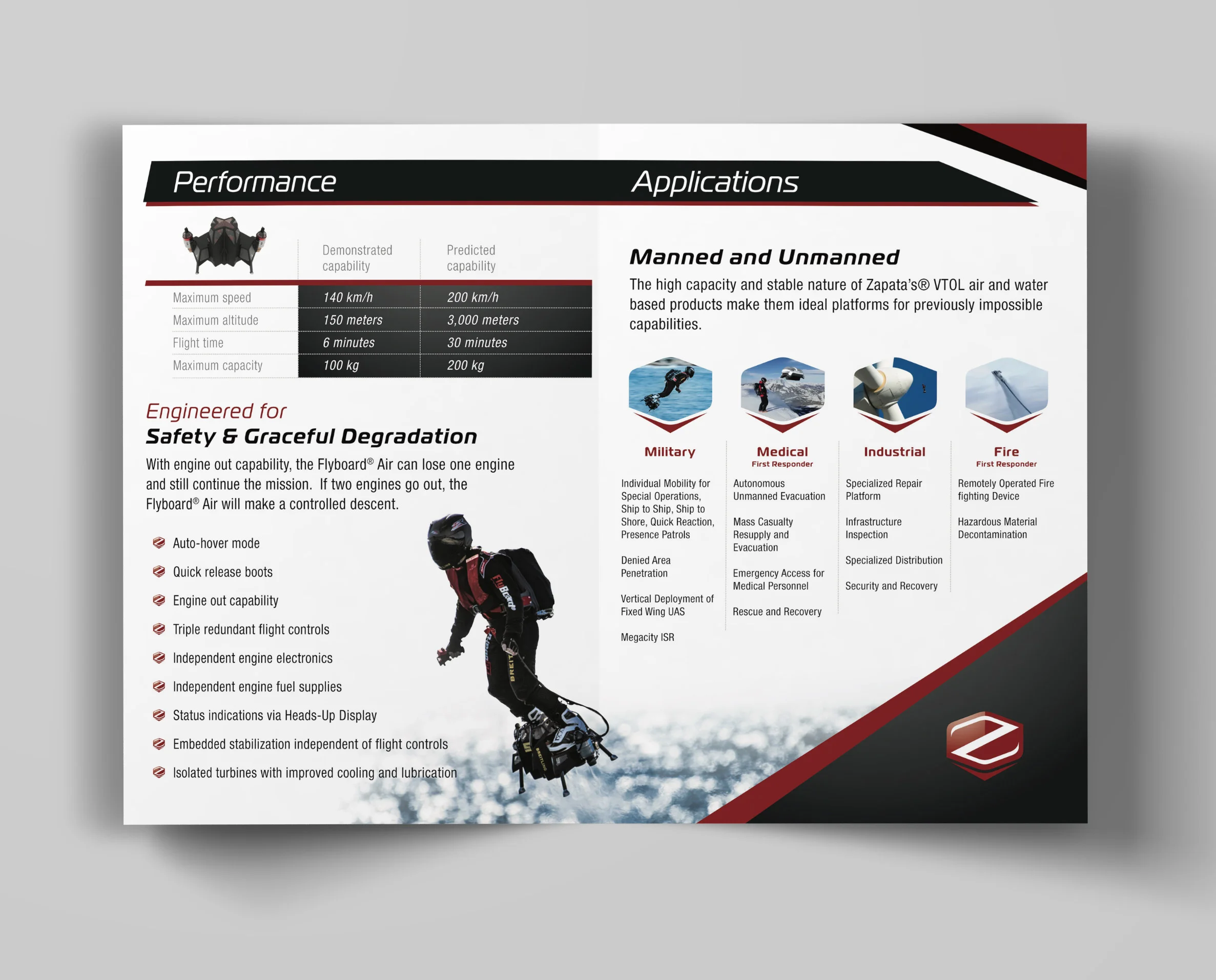 This is a brochure about the Flyboard Air. It was developed and used for the Special Operations Forces Industry Conference (SOFIC) in Tampa, Florida.